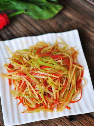 1.将土豆去皮,清洗干净,切成丝装入盘中待用。