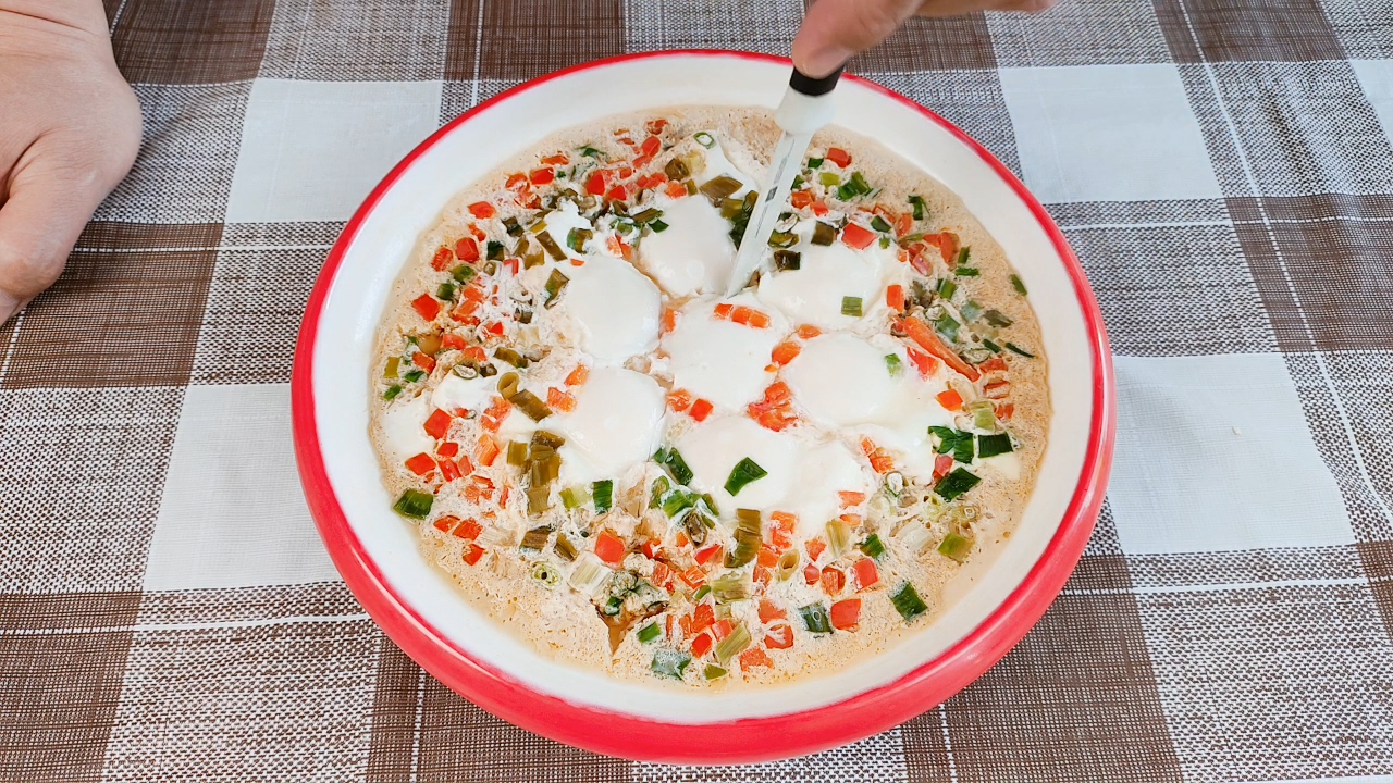 5.再撒上葱花和红椒丁煮熟之后,浇在鸡蛋上面即可。