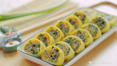 这次我搭配了菠菜、胡萝卜、粉条和鸡蛋,用豆腐皮卷成长长的一条,切成小块后,我自己都被它的颜值小小震惊了一下,没想到竟然有种做了米肠的错觉。